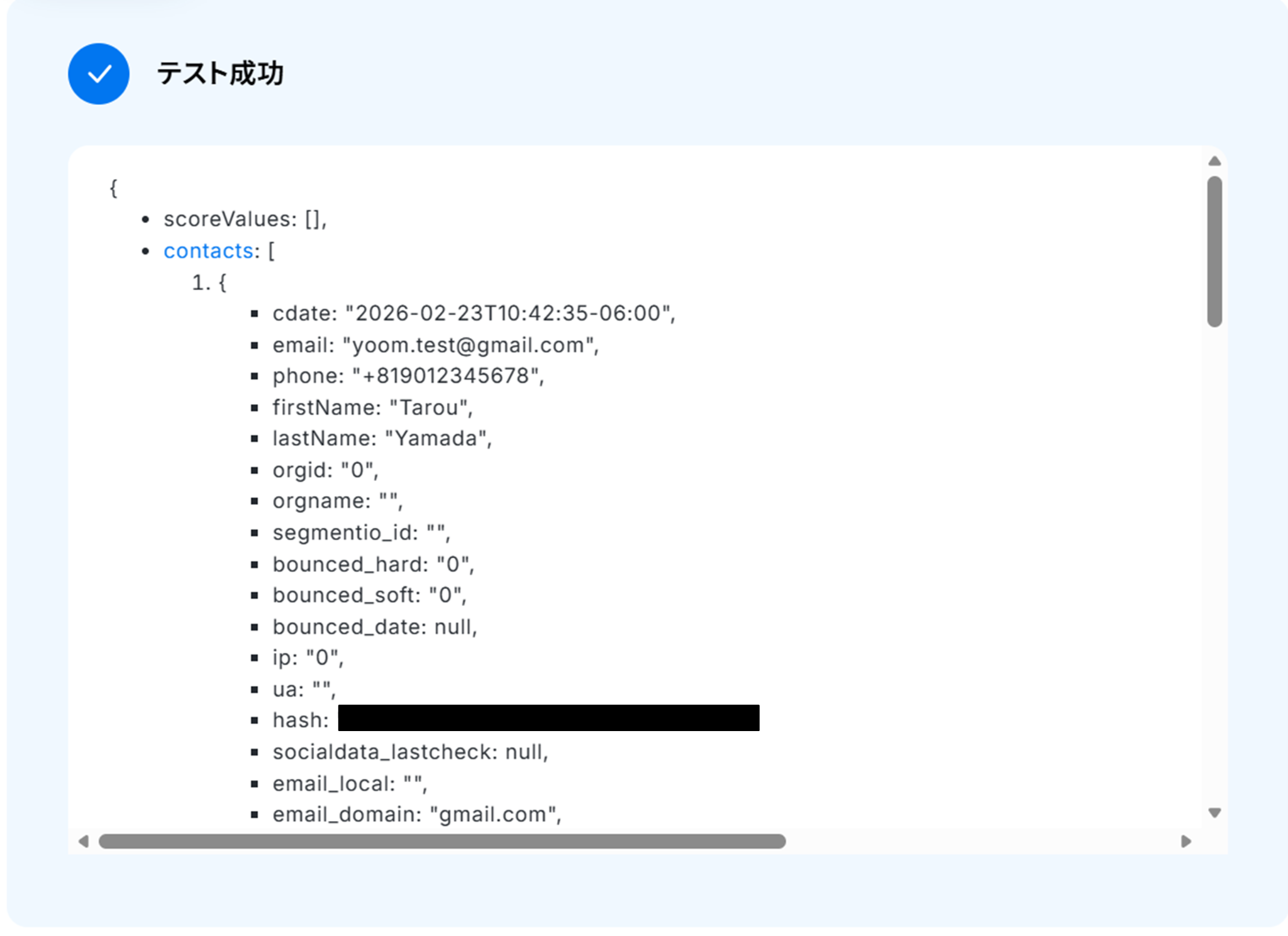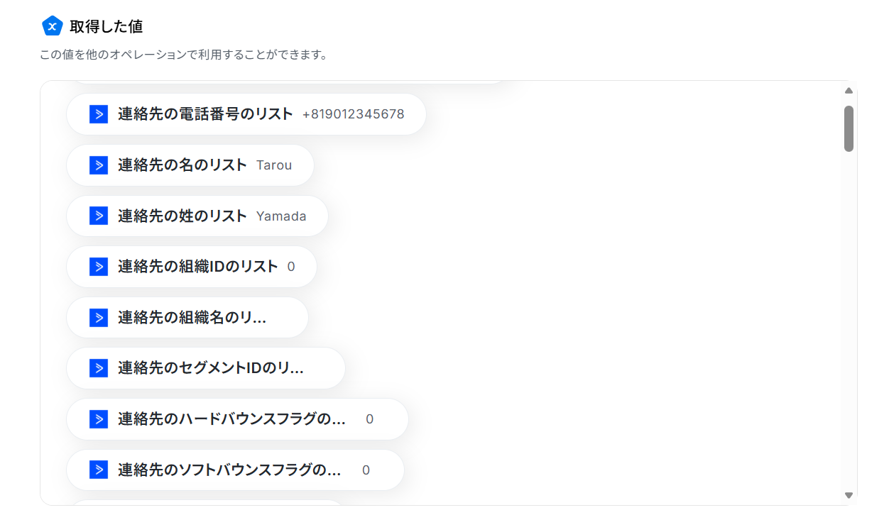 テストに成功すると、取得した値にActiveCampaignの情報が反映されます。