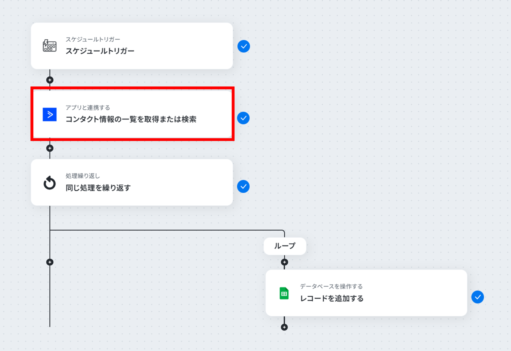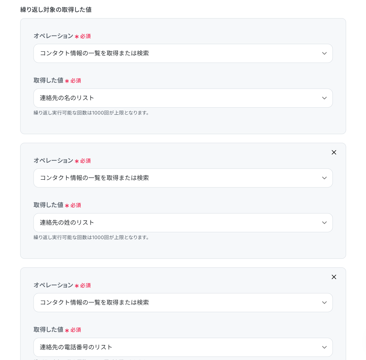 - 次に、オペレーションで、処理繰り返し機能を用いて、取得したコンタクト情報ごとに処理を繰り返すように設定する
