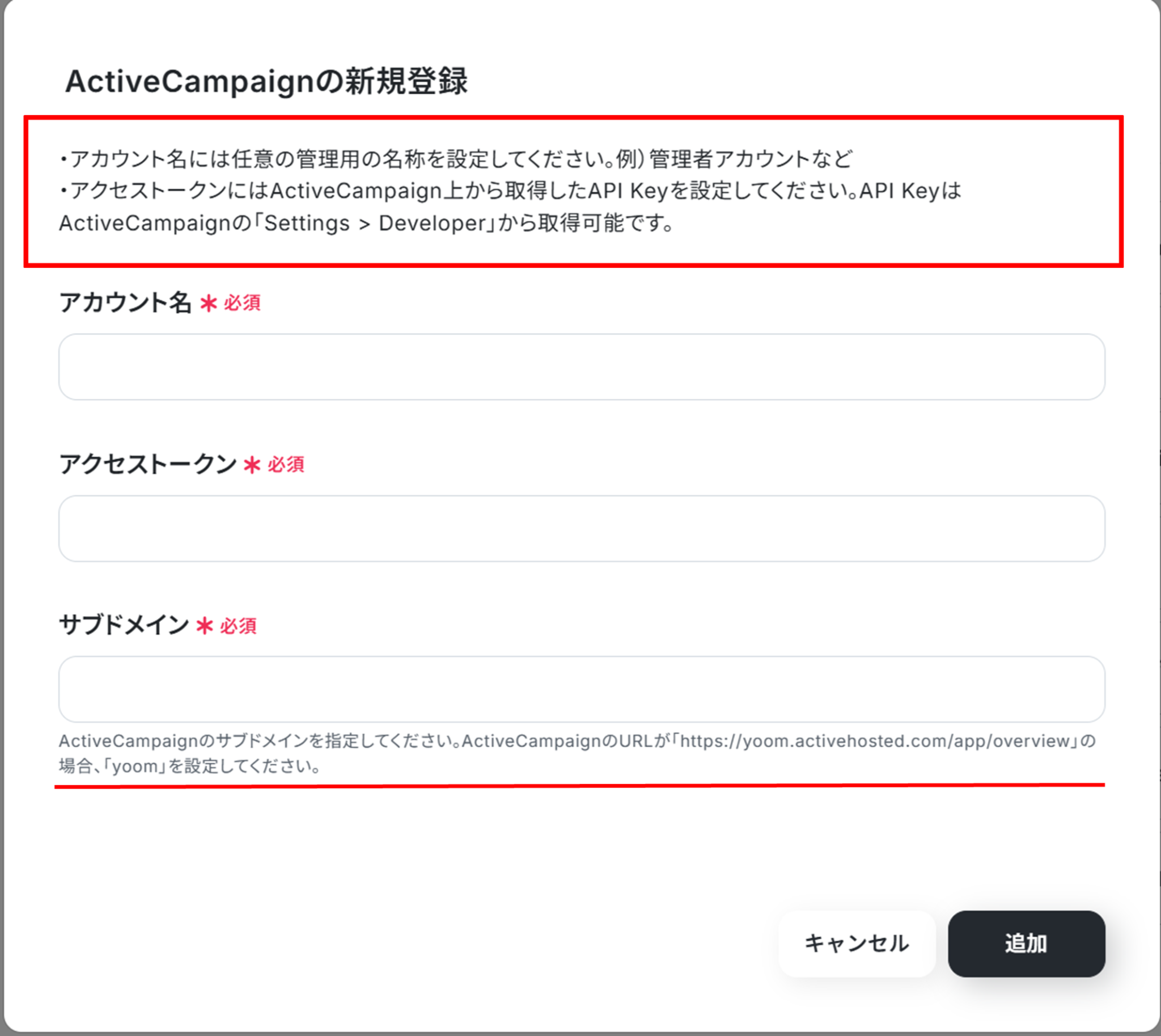 - サブドメイン:ActiveCampaignにログインし、赤線の説明を参考に入力