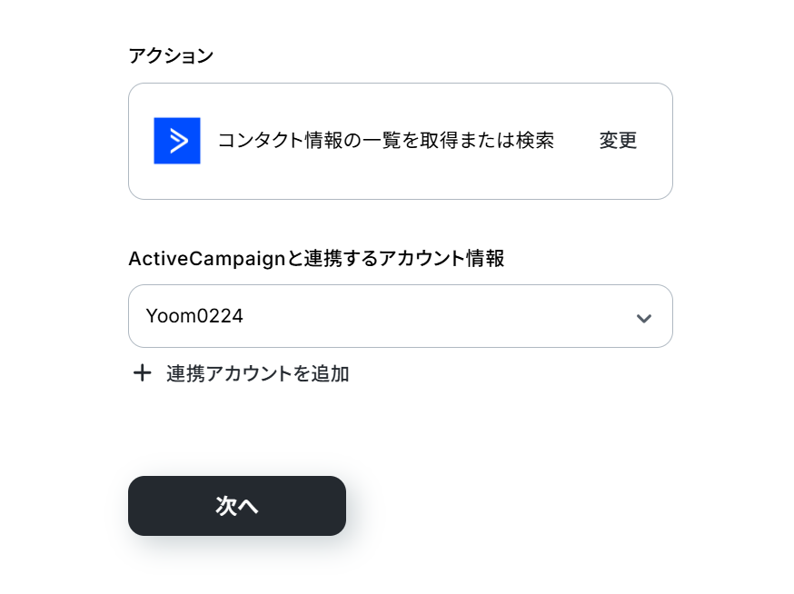 (2)「連携アカウントとアクションを選択」画面から、ActiveCampaignと連携するアカウント情報に誤りがないかを確認し、アクションは「コンタクト情報の一覧を取得または検索」のままで「次へ」をクリックしましょう。