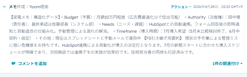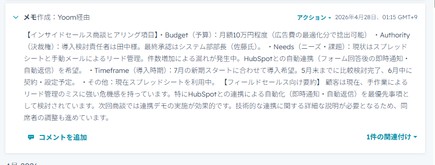 今回はコメントの追加ですが、HubSpotのアクションには、「コメントの更新」などのアクションもございます。