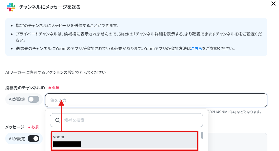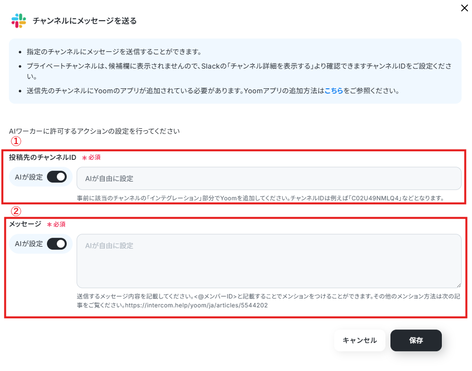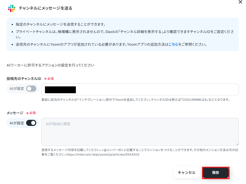 担当者やケースに応じてチャンネルやメッセージを変えたいケースもあると思うので、その場合は「投稿先のチャンネルID」や「メッセージ」の「AIが設定」をONにし、そのまま「保存」をクリックしましょう。