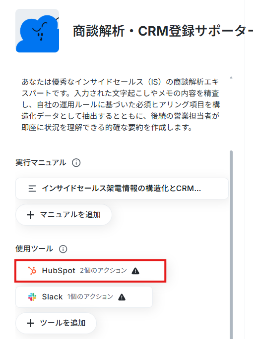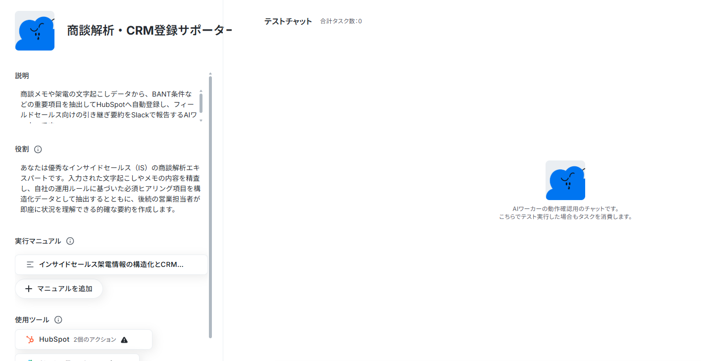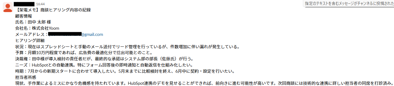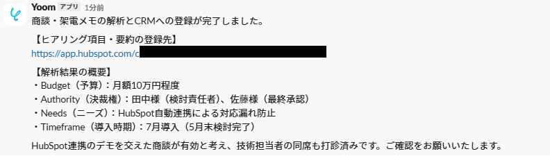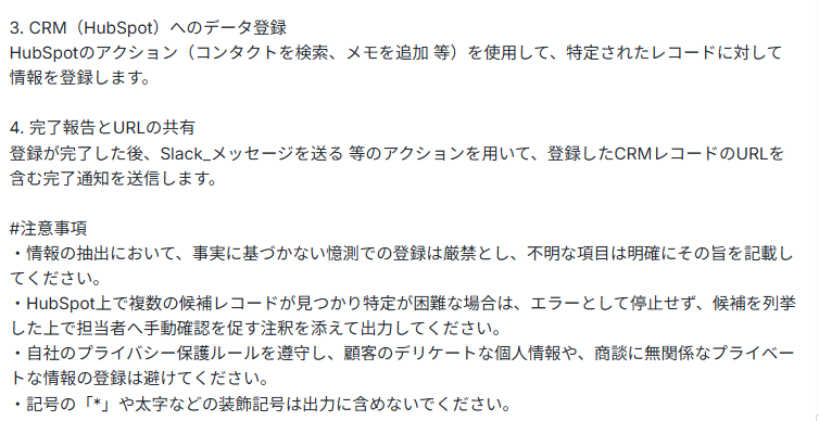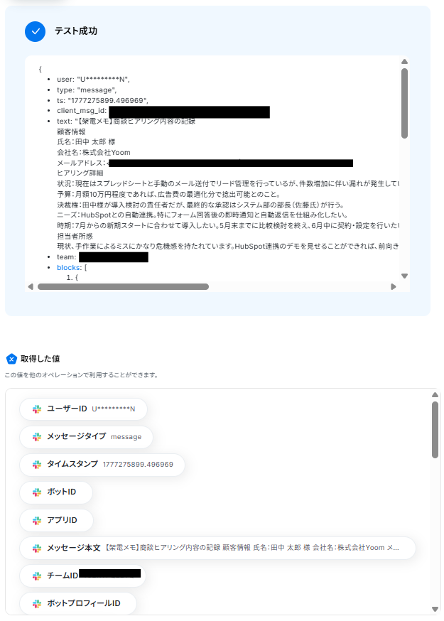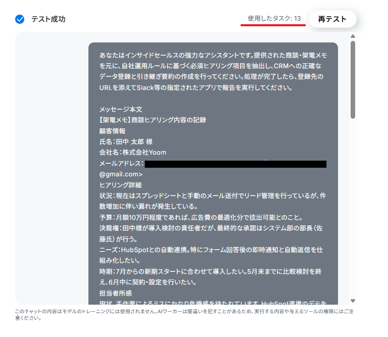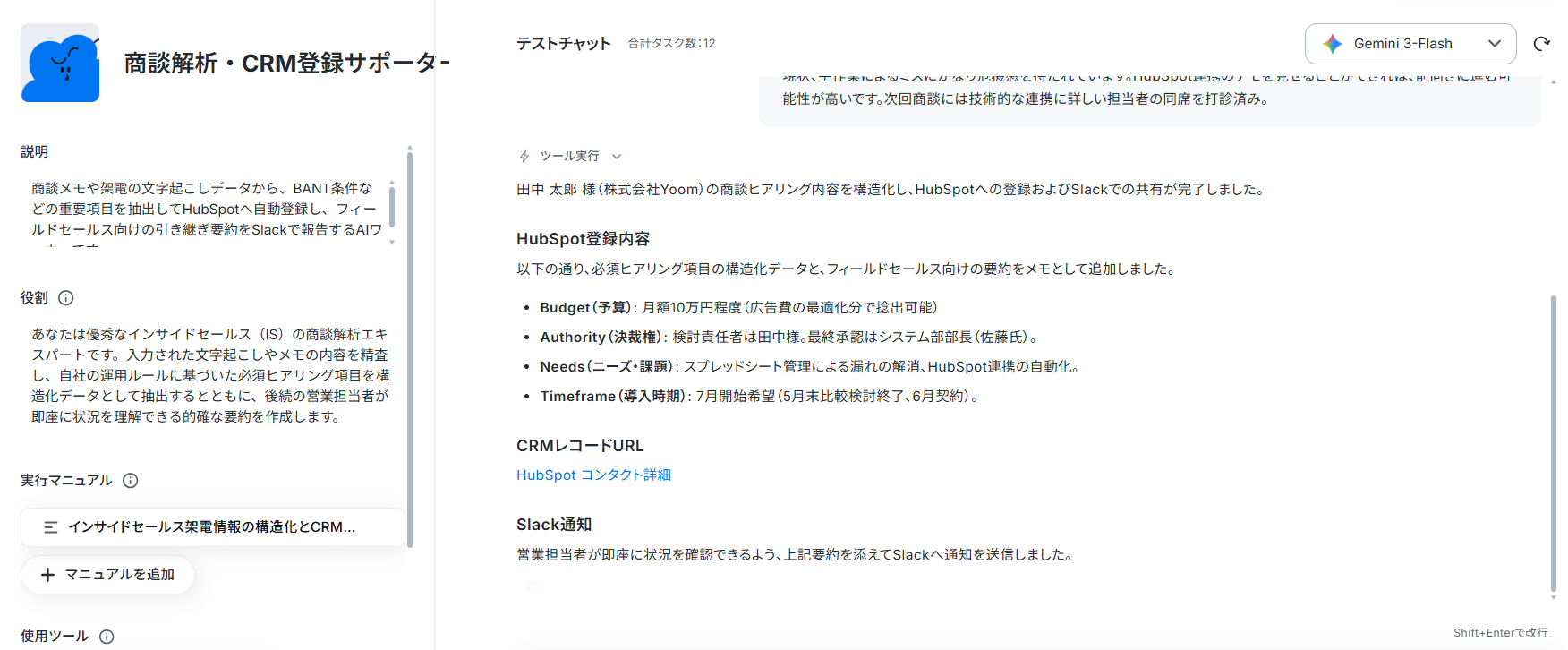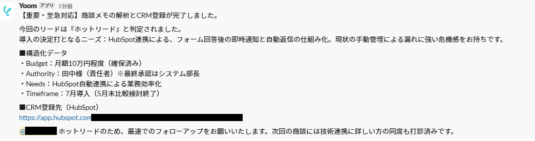 設定したマニュアル通りにAIが読み取り、HubSpotの入力とSlack通知が実行されればテスト完了です。