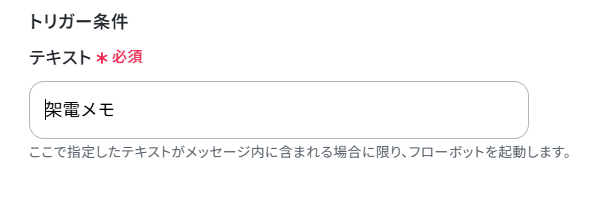 また、今回は「架電メモ」が含まれたメッセージが投稿された際にトリガーが起動するよう、以下のように設定しています。