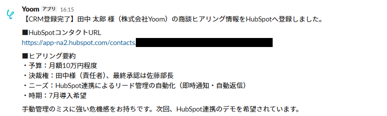 HubSpotやSlackも確認すると、ちゃんと反映されていました!