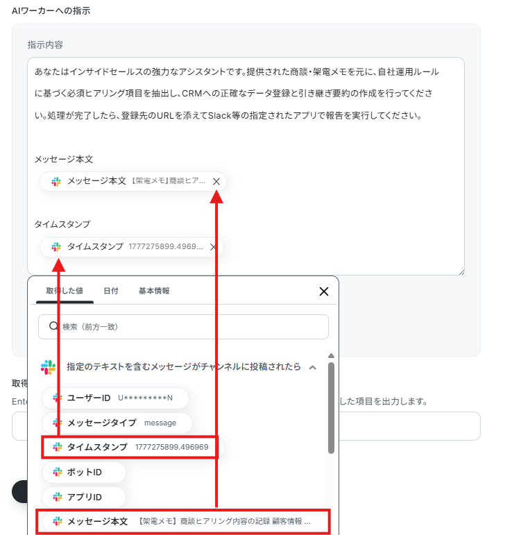トリガーで取得したSlackの投稿内容(文字起こしデータなど)を、先ほど作成したAIワーカーに渡す設定です。