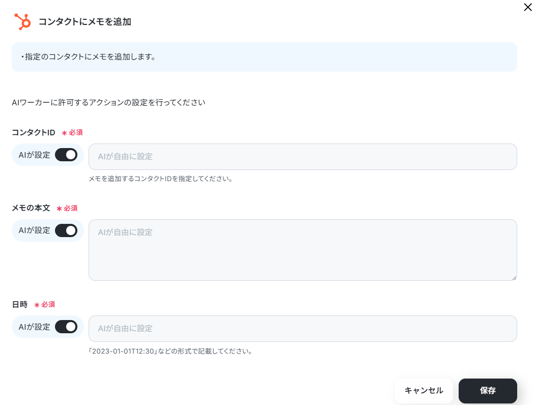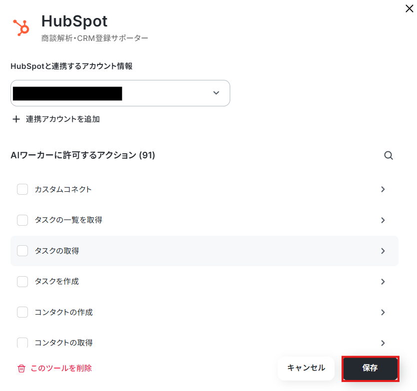 例えば、カスタマイズオブジェクトのレコードにメモを追加する場合、AIワーカーの「使用ツール設定」において、HubSpotの「カスタムオブジェクトのレコードにメモも追加」を選択する必要があります。