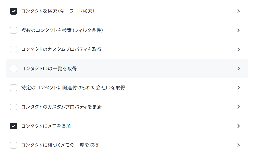アクションは「コンタクトを検索(キーワード検索)」と「コンタクトにメモを追加」