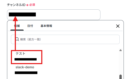 「投稿先のチャンネルID」はボックスの候補から選択します。毎回同じチャンネルにメッセージを送りたい場合はここで設定しておくと便利です。