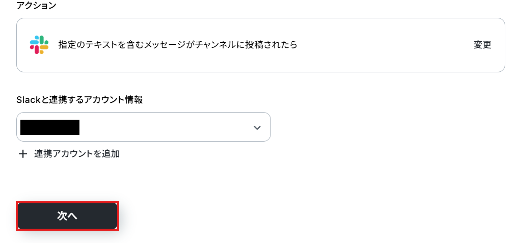 「指定のテキストを含むメッセージがチャンネルに投稿されたら」をクリックしてみましょう!