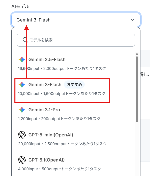 Gemini・ChatGPT・Claudeのモデルをプルダウンで選択できるので、適したものを選びましょう。なお、おすすめは「Gemini-3-Flash」です。
