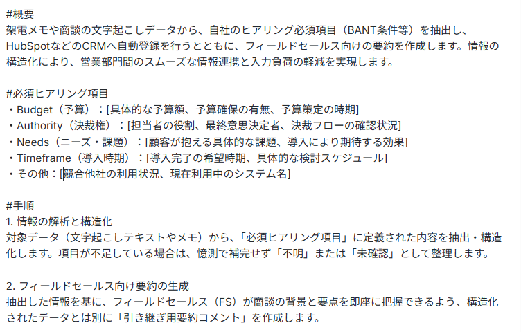 【マニュアル設定の例】:「送信された商談録には弊社担当者と顧客の両方の発言が含まれています。抽出対象は『顧客(または社外の参加者)』の発言のみとし、弊社担当者の発言や相槌は除外してください。顧客が抱えている課題、現状の運用、質問事項の3点に絞って構造化してください。」