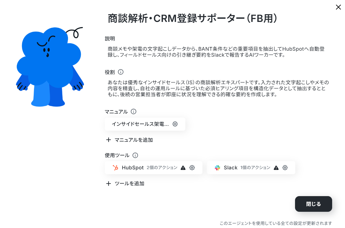中身を調整したい場合は、商談解析・CRM登録サポーターのAIワーカーを作ってみようの見出しを参考にして設定してみてくださいね。