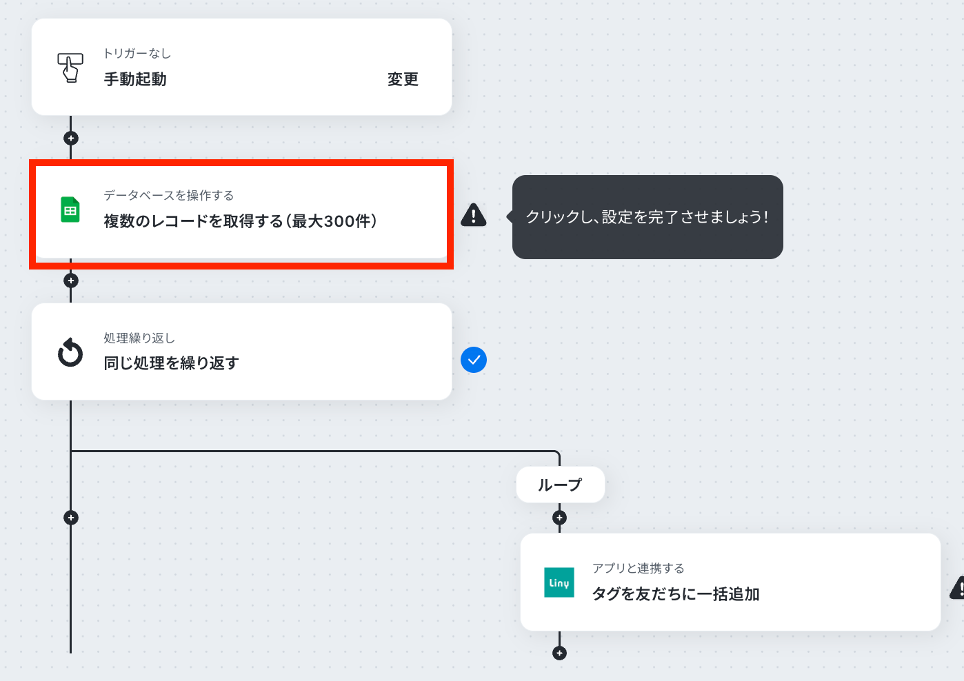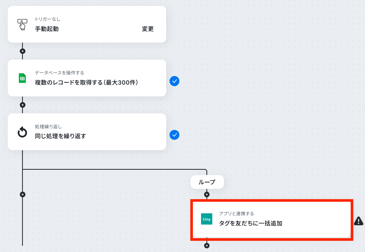 Google スプレッドシートの設定では、タグ付け対象の友だちリストが記載された任意のスプレッドシートIDやシート名、レコード取得条件などを設定してください。 ループ機能の設定では、前段のGoogle スプレッドシートから取得した情報のうち、繰り返し処理をしたい値(友だちIDなど)を任意で設定してください。 Linyの設定では、追加したいタグのIDを任意で設定してください。 ■注意事項