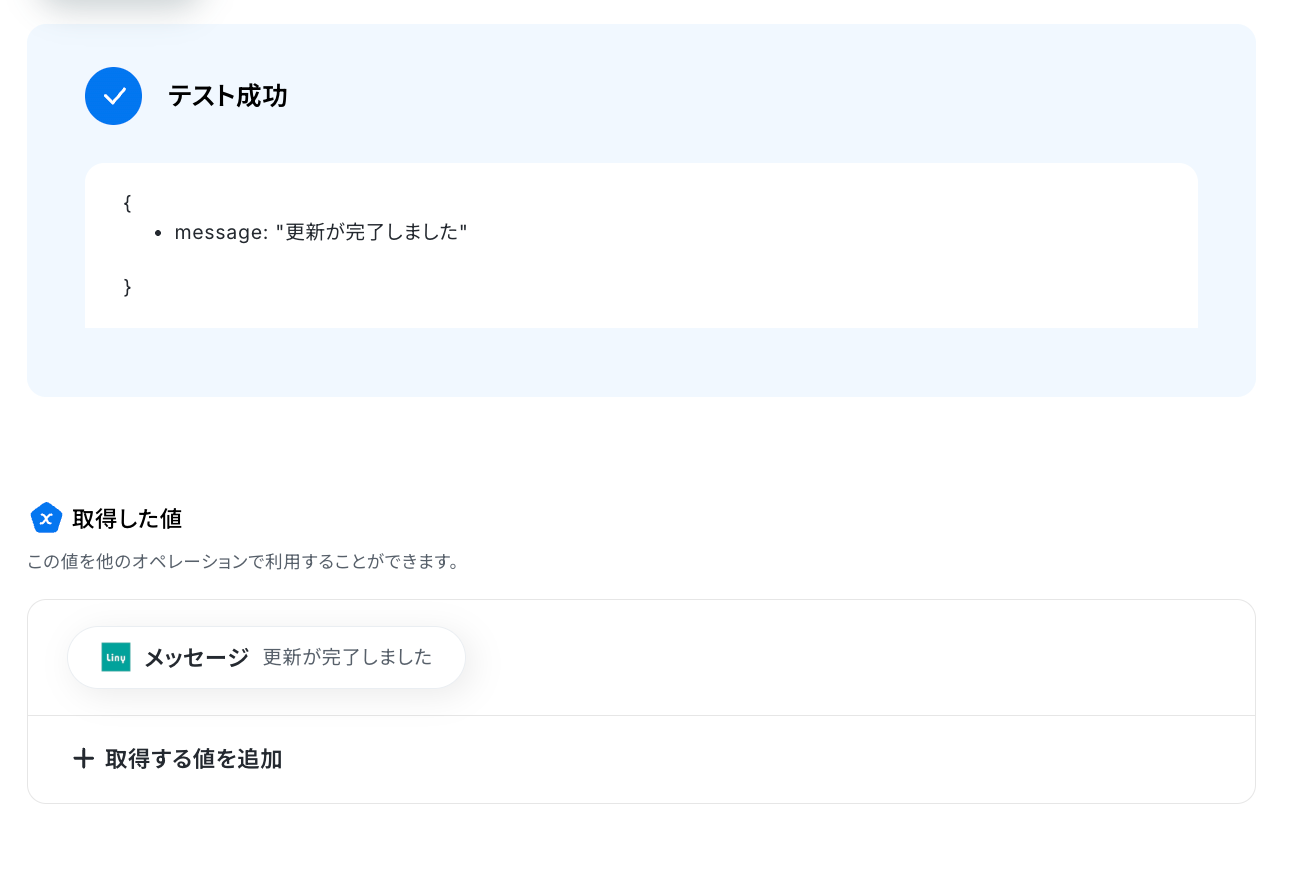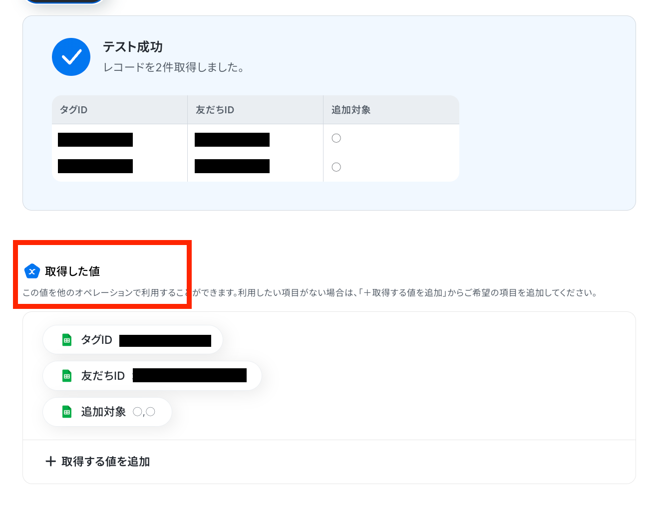 テスト成功で、レコードの情報が取得した値 に反映されます。