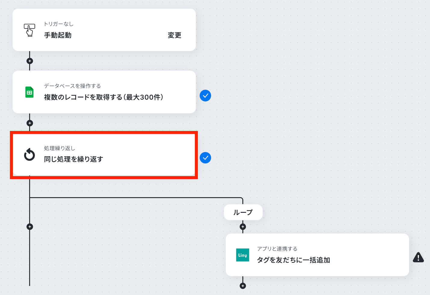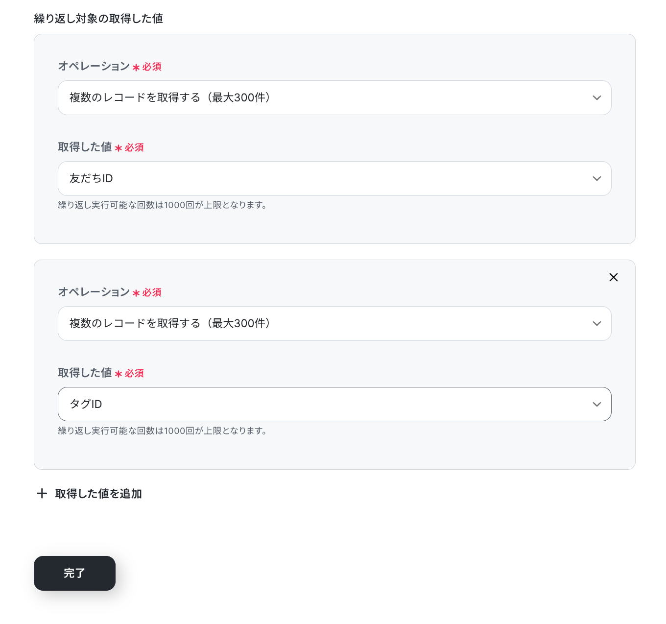 ※「同じ処理を繰り返す」オペレーション間の操作は、チームプラン・サクセスプランでのみご利用いただける機能となっております。