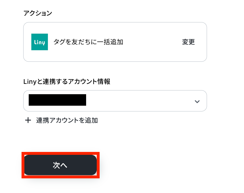 ステップ5:Linyのアクション設定 これまでに取得した値を使用して、Linyの友だち情報にタグを追加する設定を行います。 最後の赤枠をクリックしましょう!