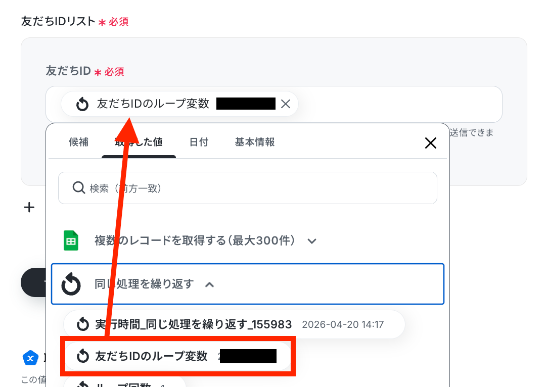 ステップ4:同じ処理を繰り返す設定 繰り返しの処理を行うための設定を行います。3つ目の赤枠をクリックしましょう。
