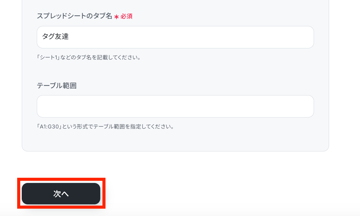 続いて、スプレッドシート内のタブ名も選択して、テーブル範囲を任意で設定したら、次の設定へ進みます。