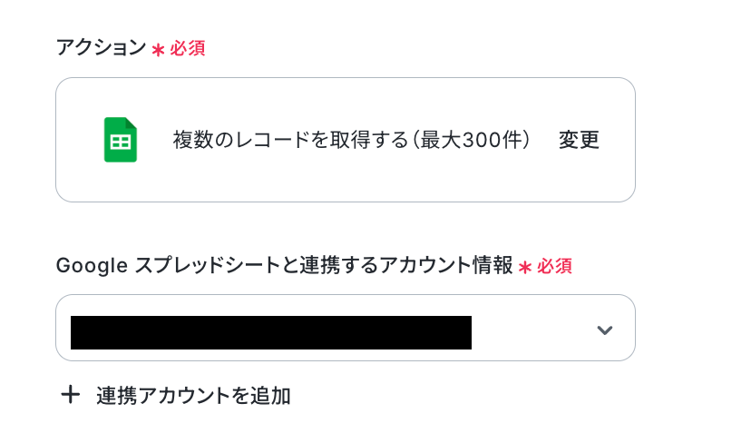 アクションは、テンプレート通りに「複数のレコードを取得する」のままで大丈夫です。 アカウントがしっかりと連携されているかを確認したら、次の設定へ進みましょう!