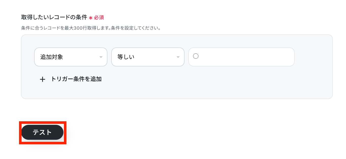 取得したいレコードの条件を設定します。今回は、追加対象が◯の印の友達のレコードを取得しますので、条件を以下のように設定して「テスト」ボタンを押しましょう。