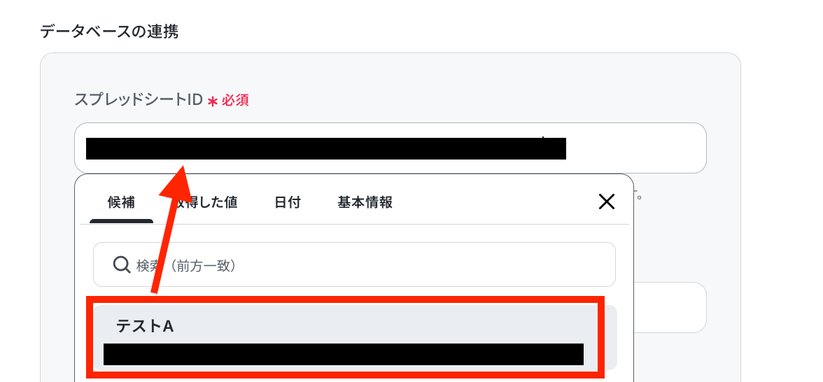 Yoomの設定に戻りましょう!空欄をクリックして、候補の中からレコードを取得したいスプレッドシートを選択します。