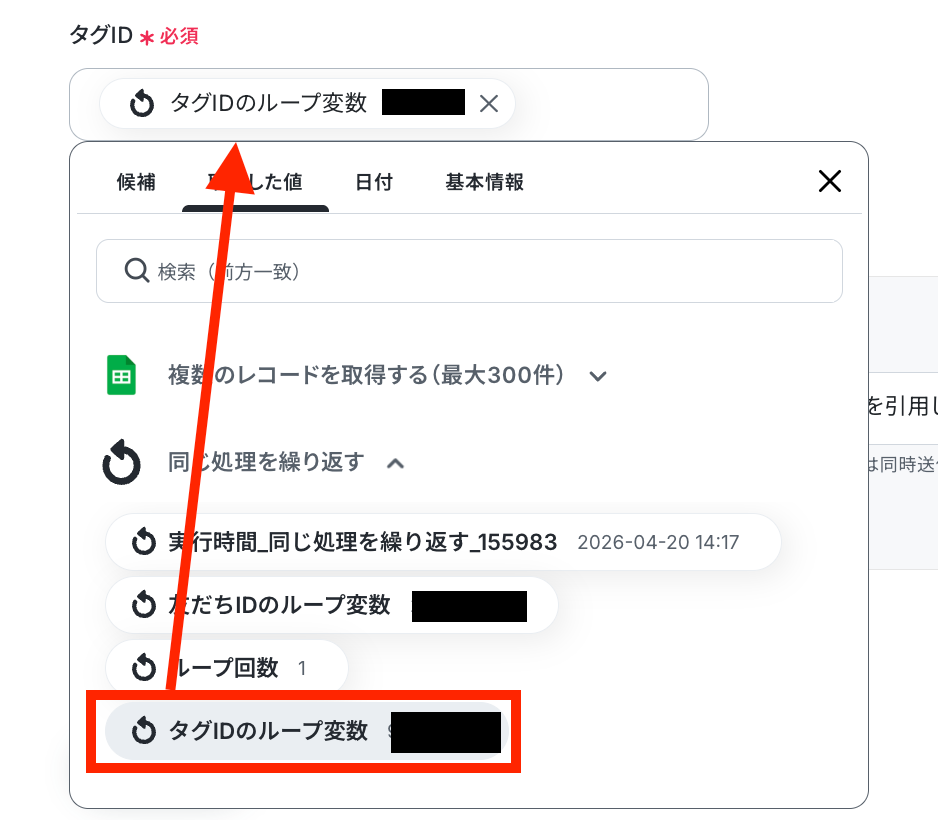 タグIDを取得した値から選択して設定します。