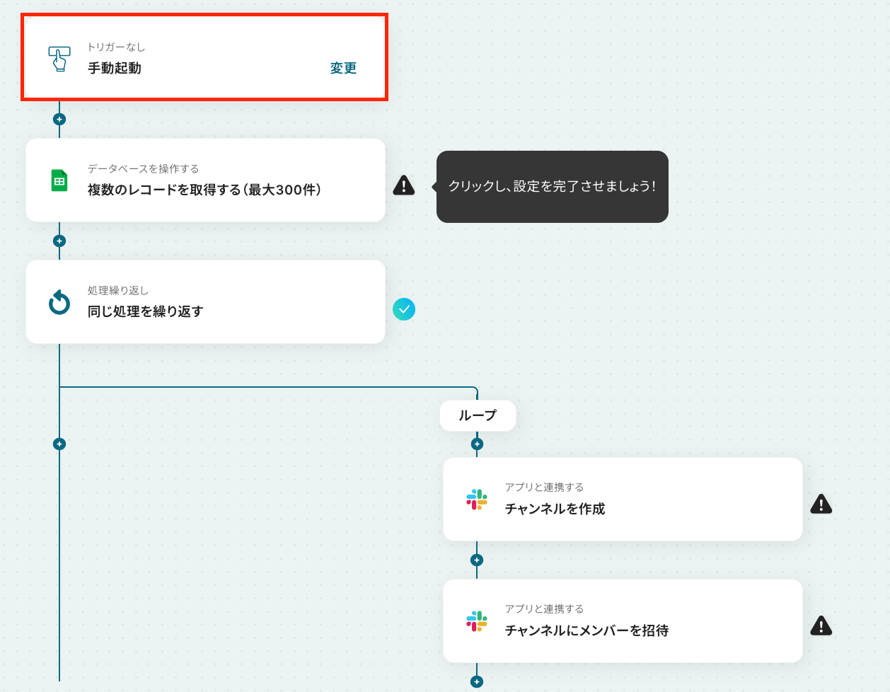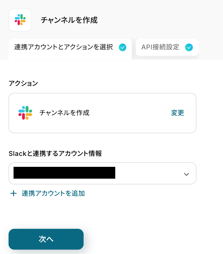 - ループ内の処理として、Slackの「チャンネルを作成」アクションを設定します