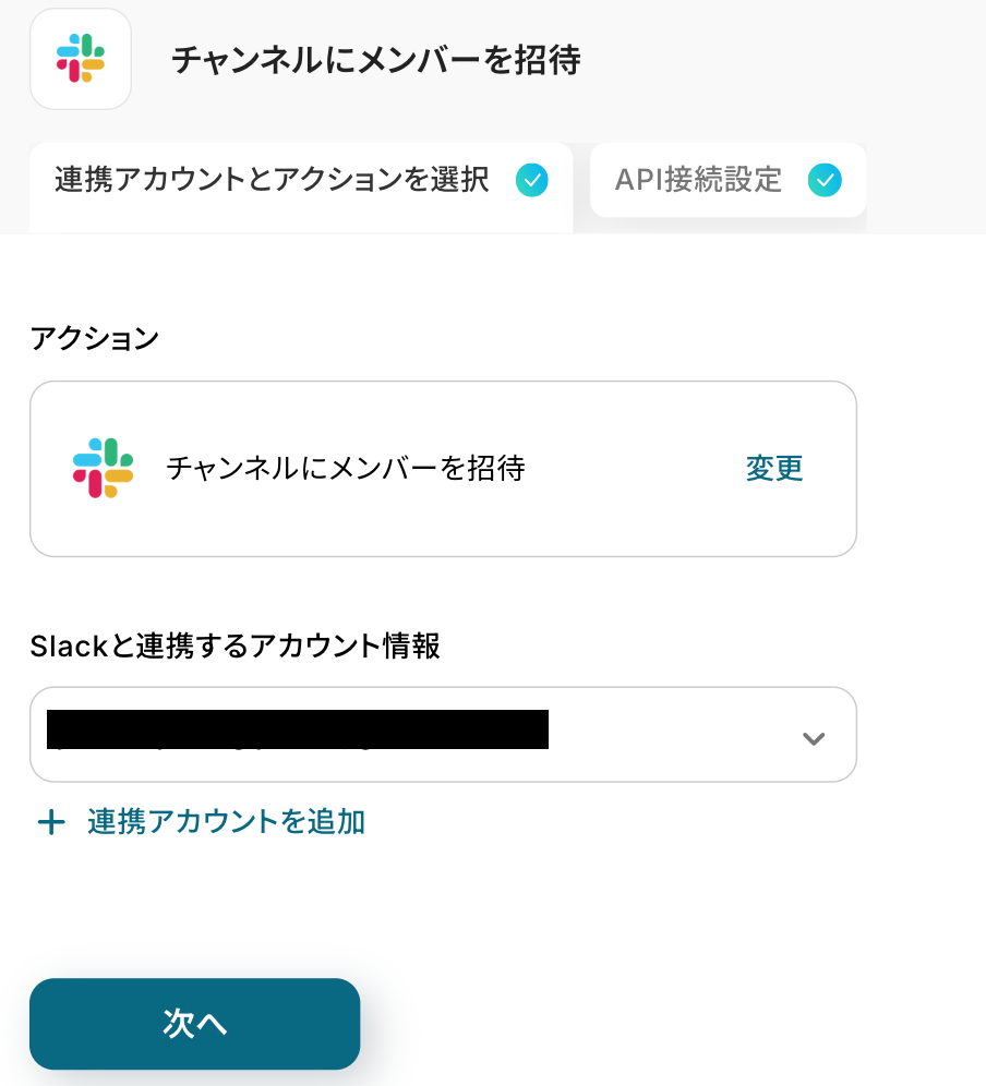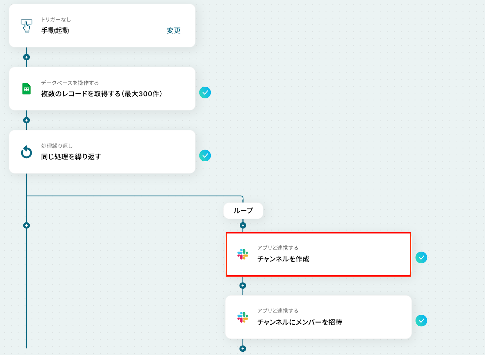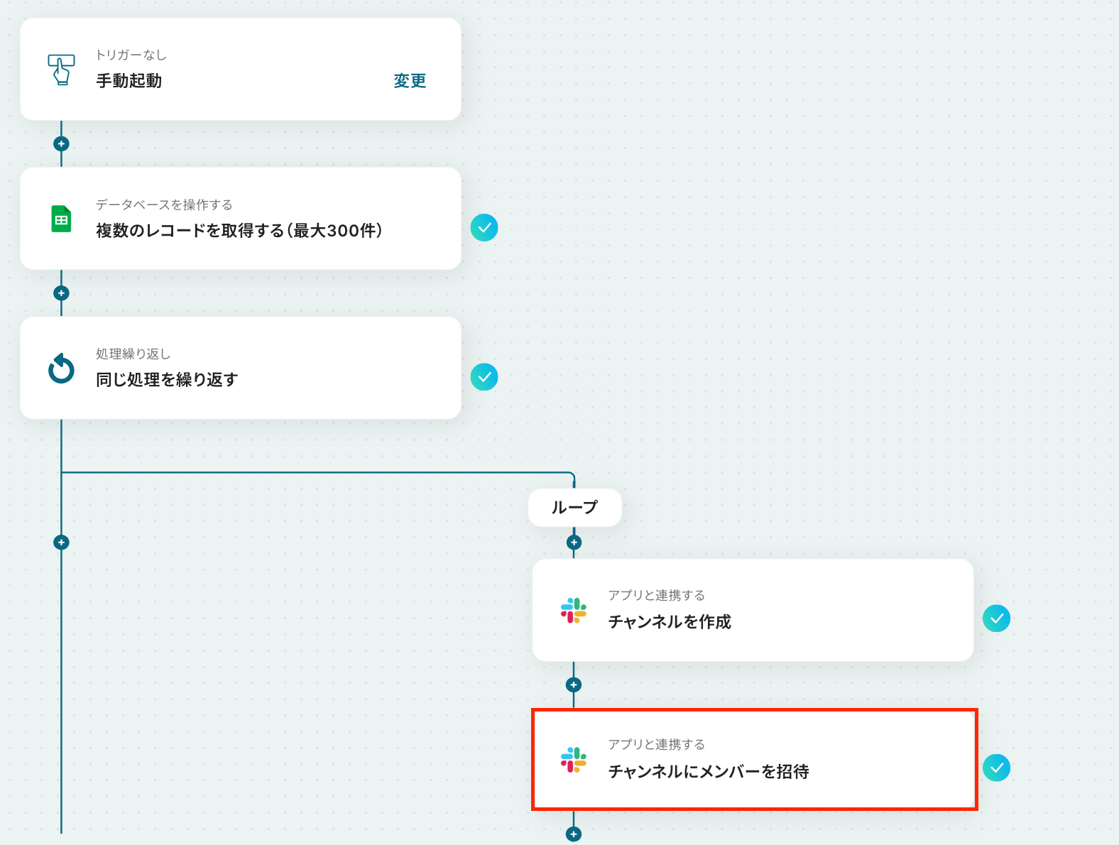 - 最後に、同じくループ内でSlackの「チャンネルにメンバーを招待」アクションを設定し、作成したチャンネルにメンバーを自動で招待します