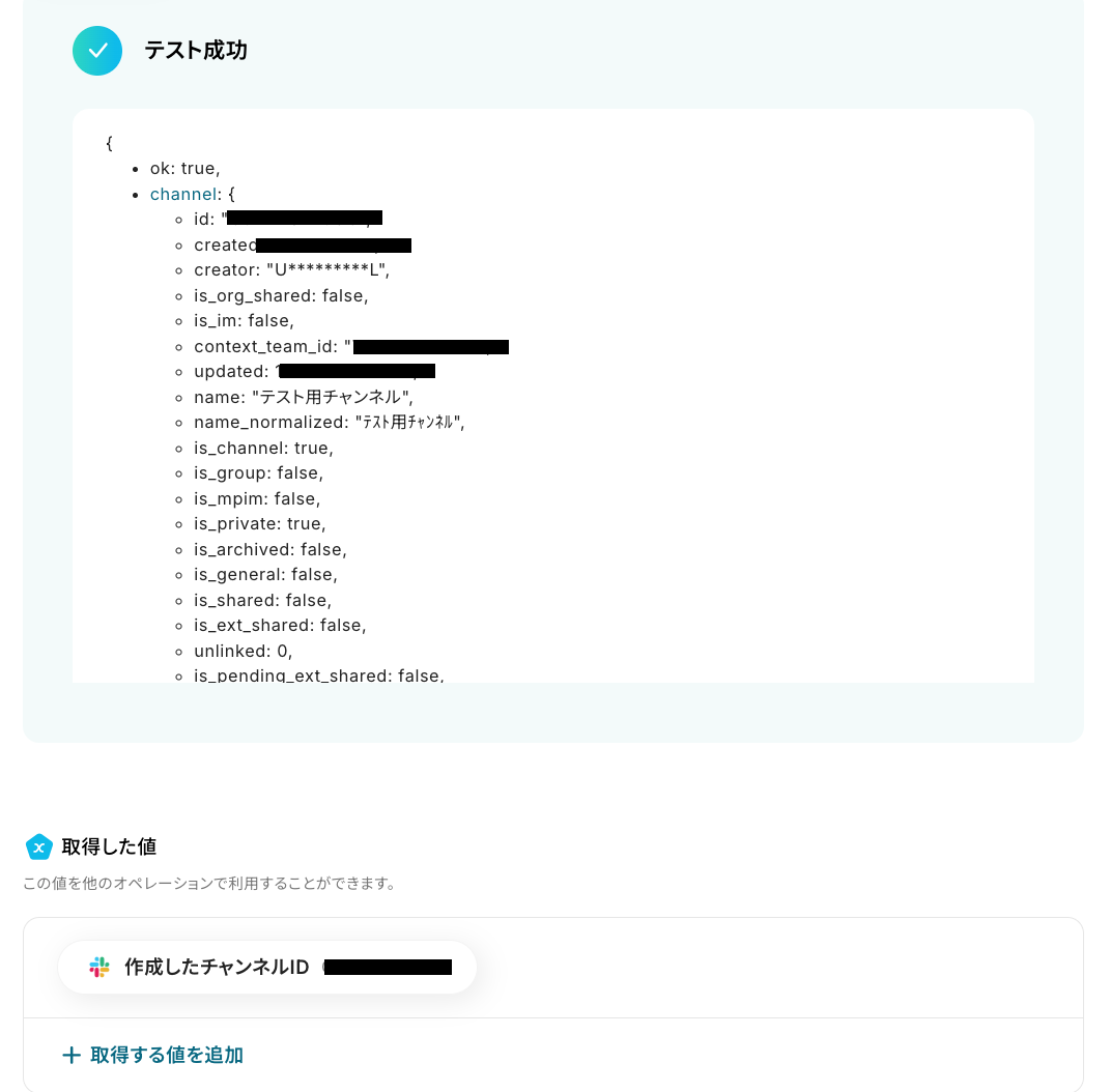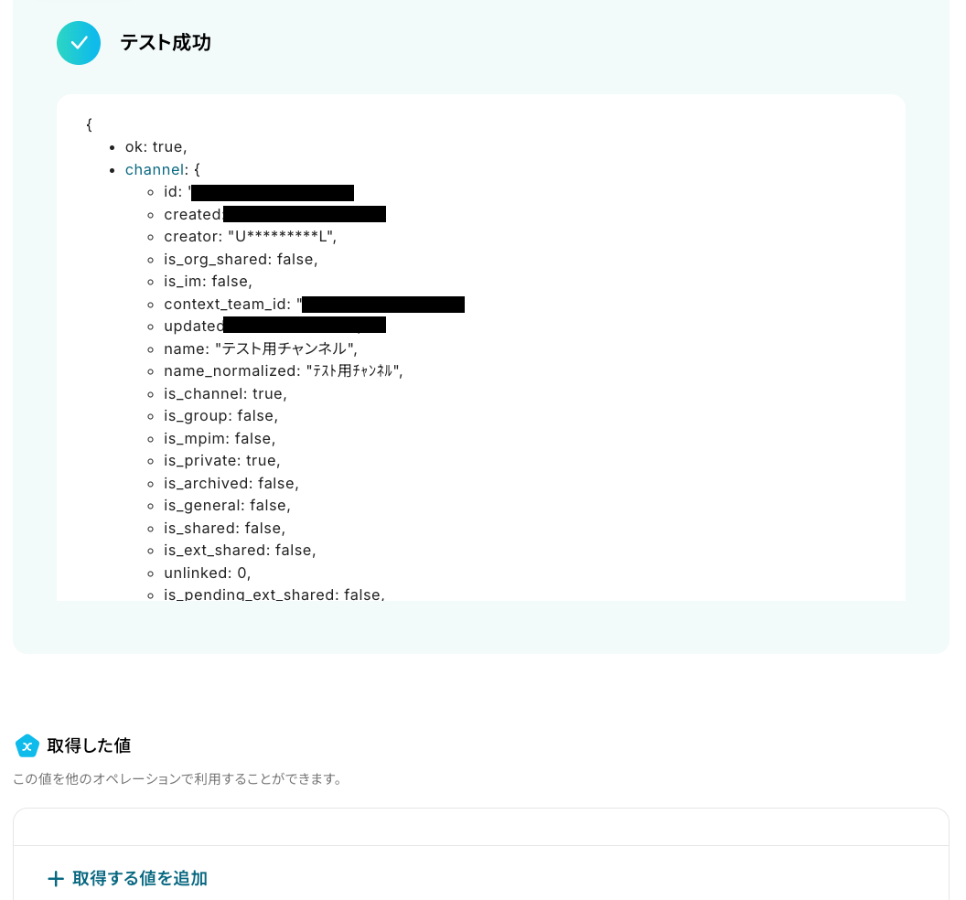 ここでは、分岐条件で指定した条件に合致した場合に、Slackでプライベートチャンネルを作成するアクションを設定します。