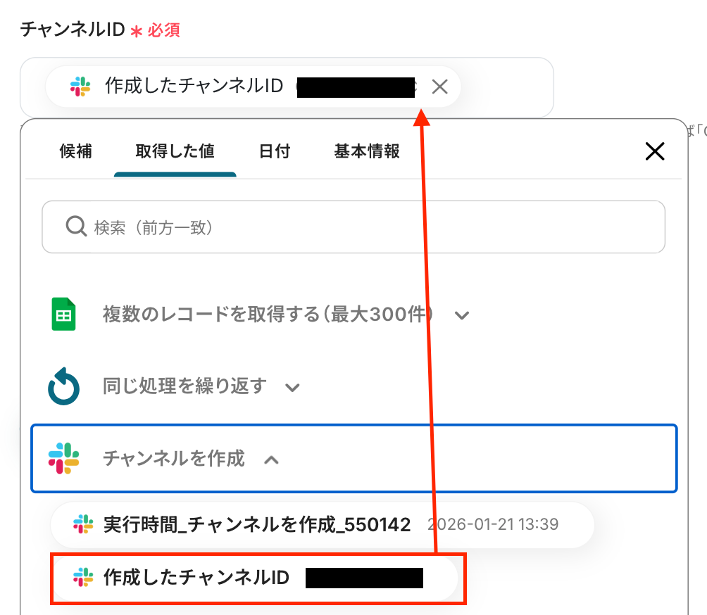 「取得した値」は、下記画像のように、先ほどのステップで取得した値を設定します。