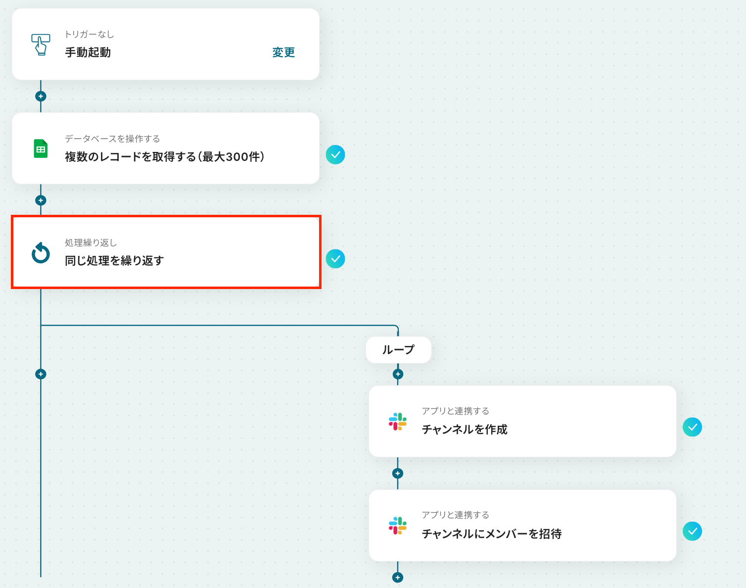 - 「同じ処理を繰り返す」オペレーション間の操作は、チームプラン・サクセスプランでのみご利用いただける機能となっております。フリープラン・ミニプランの場合は設定しているフローボットのオペレーションやデータコネクトはエラーとなりますので、ご注意ください。