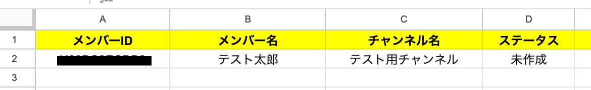 シートには今回作成する「チャンネル名」と、作成したチャンネルに招待したいメンバーの「メンバーID」を設定してください。