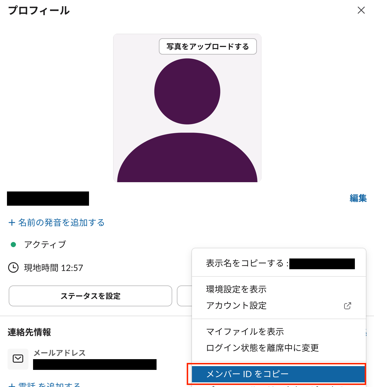 ※「メンバーID」は、Slackの画面で該当のメンバーをクリックし、「︙」→「メンバーIDをコピー」から確認出来ます。