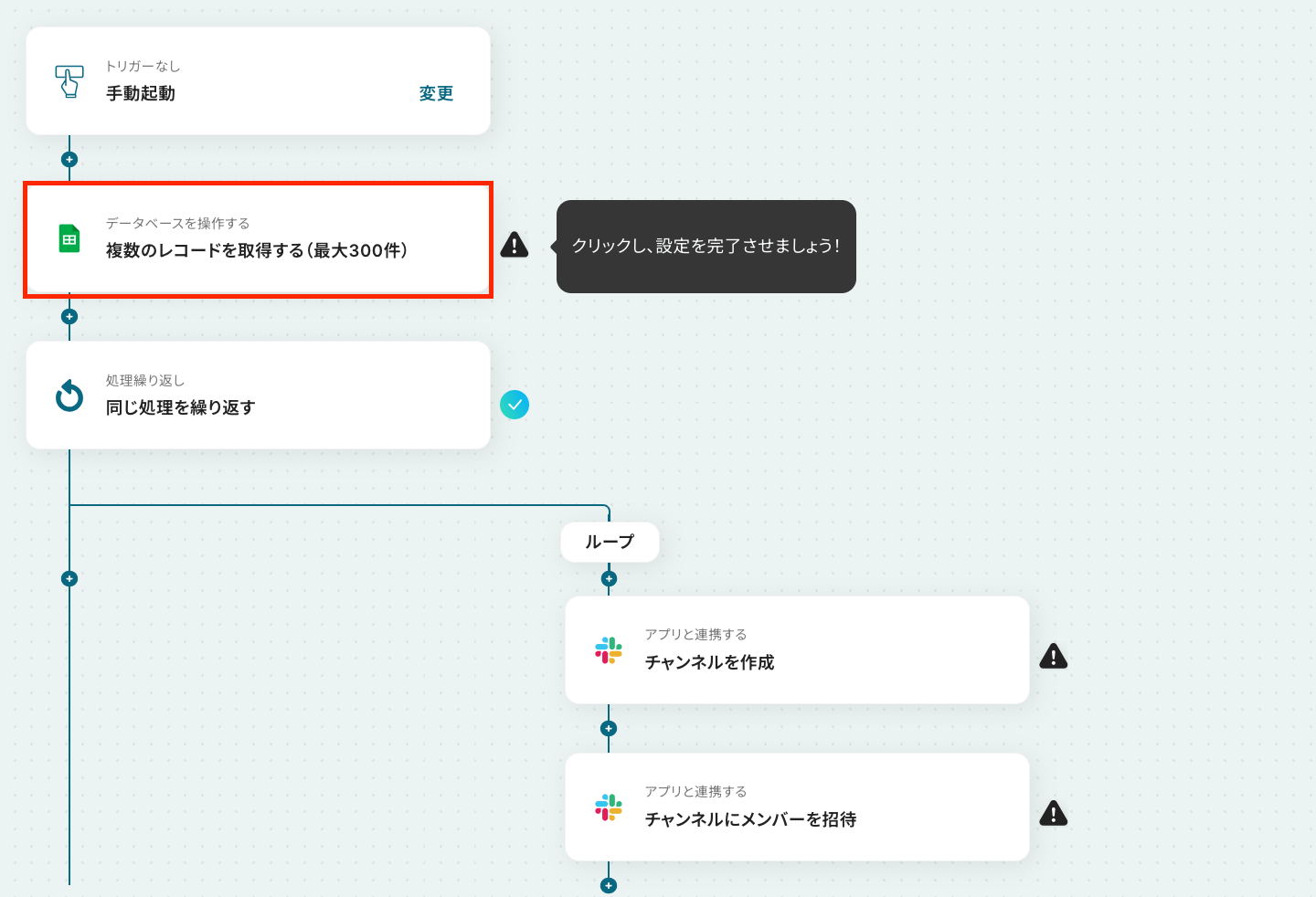 ここでは、Google スプレッドシートで複数のレコードを取得する設定を行います。