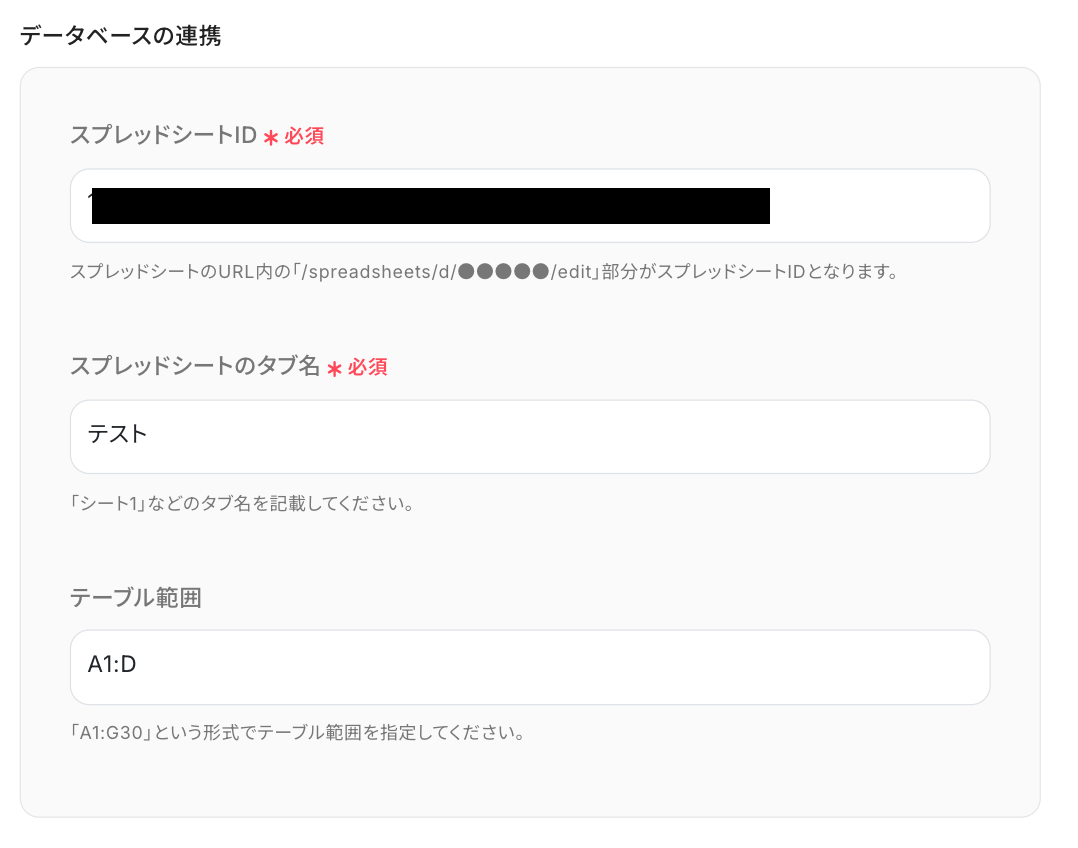 「テーブル範囲」は、Google スプレッドシートの対象となる範囲を英字で設定してください。