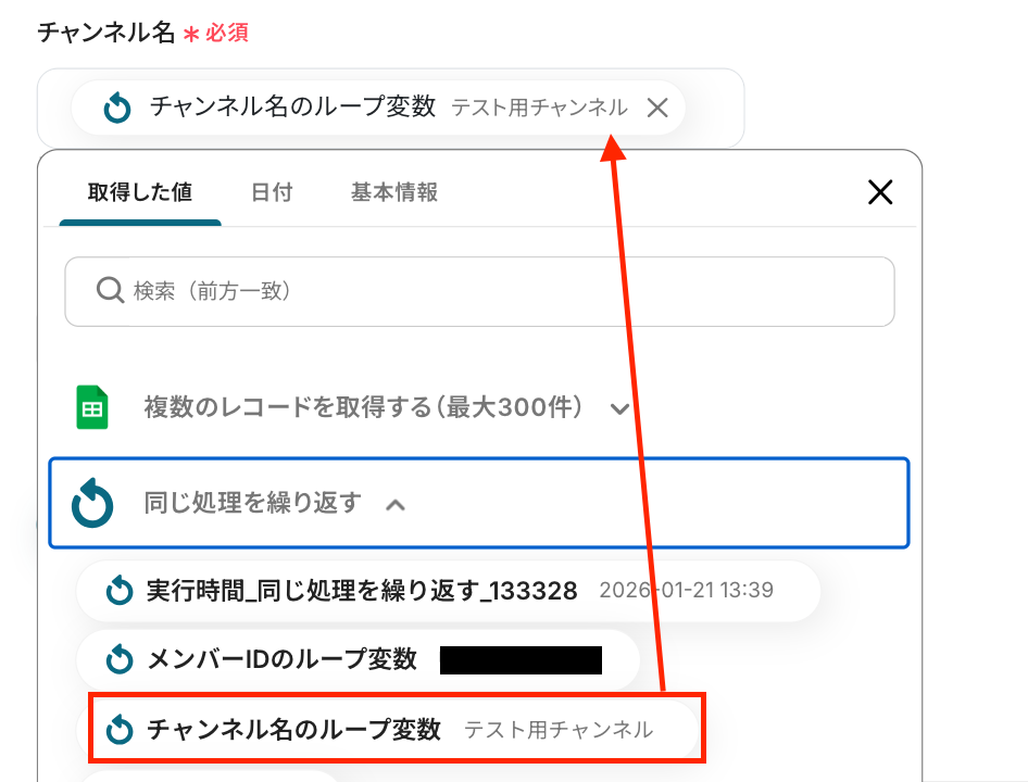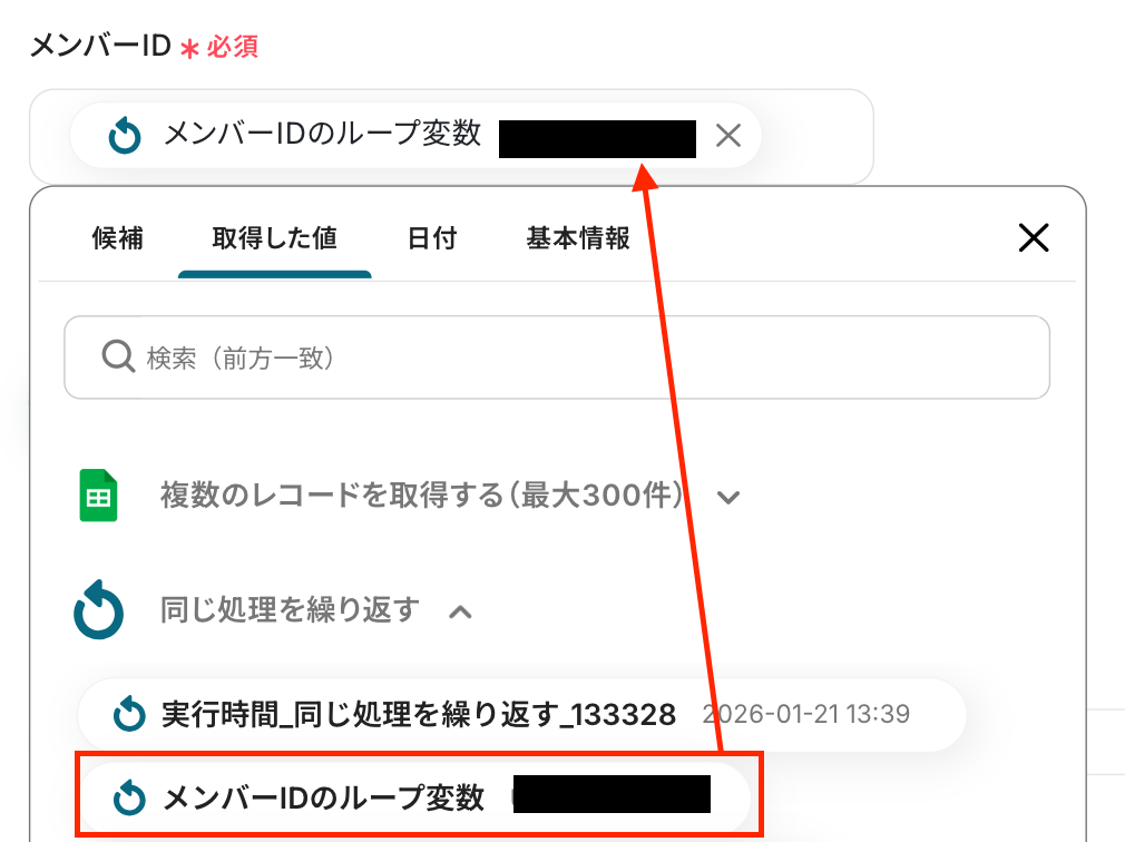 - ループ機能では、前段のGoogle スプレッドシートで取得したレコード情報の中から、繰り返し処理を行いたい値を任意で設定できます