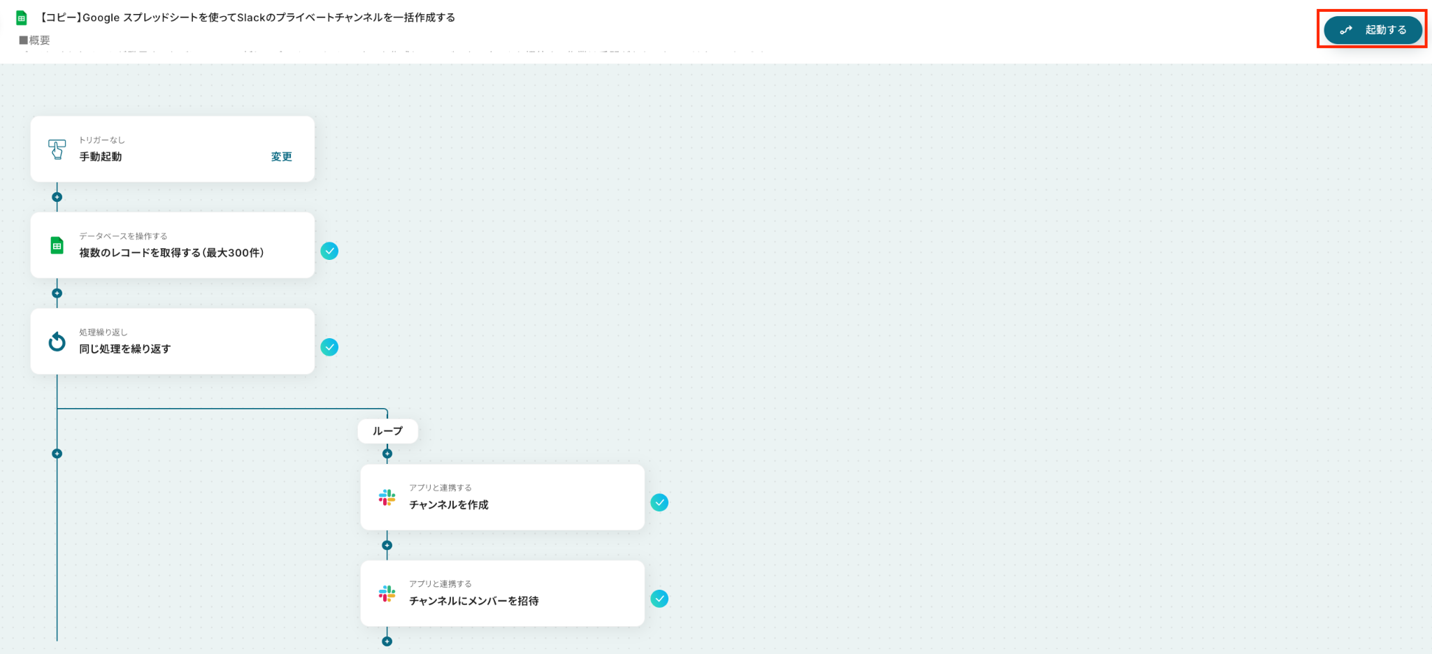 それではここから代表的な例として、Google スプレッドシートの情報をもとに、Slackのプライベートチャンネルを一括で作成するフローを解説していきます!