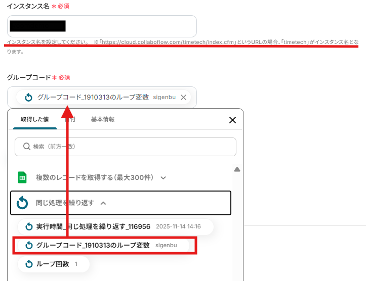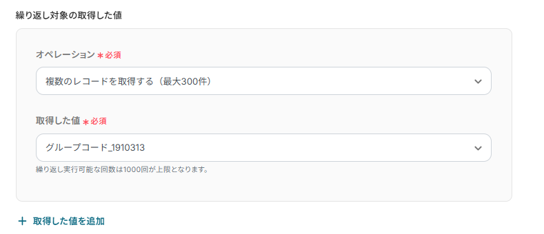 ここでは、繰り返しグループコードを取得したいので、以下のように設定しました。