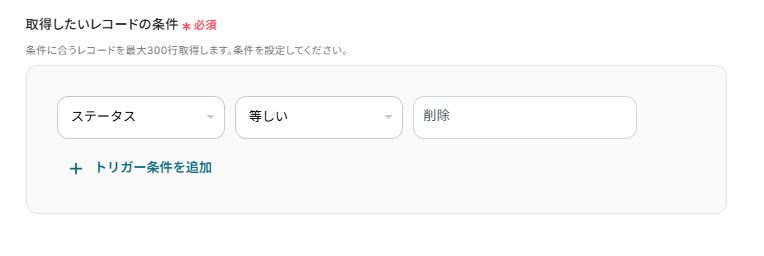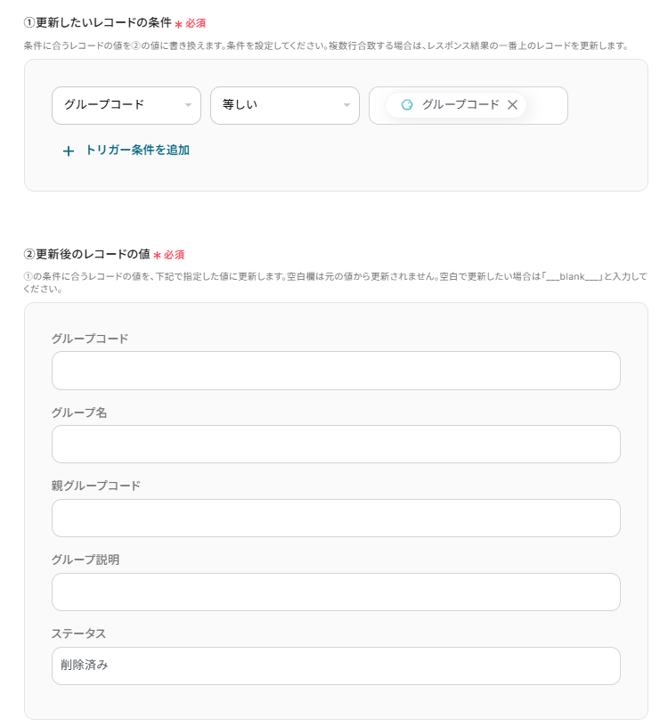 更新したいレコードは先ほどまで「削除」だったステータスを「削除済み」に変更したいので、以下のように設定しました。