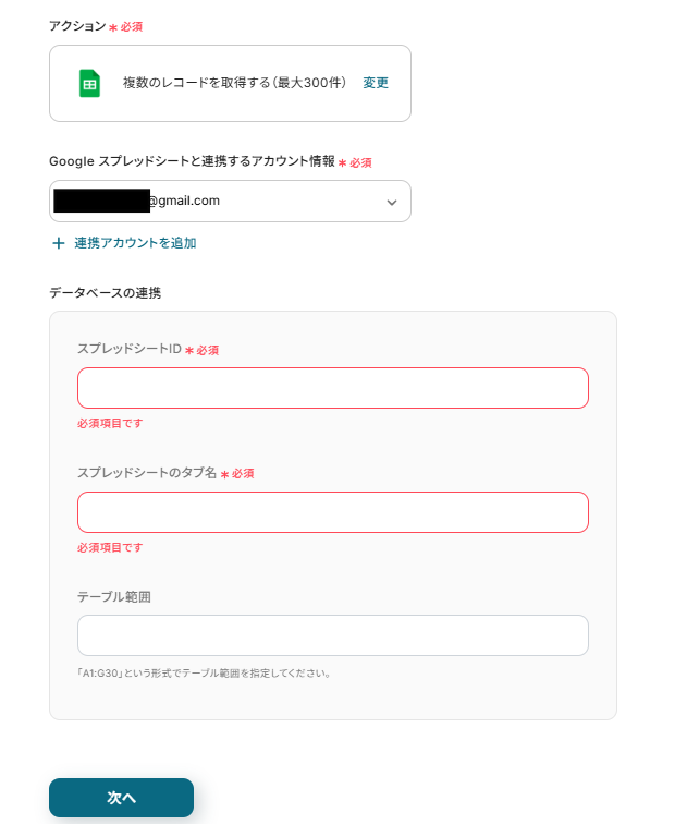 アクションは変更せず、アカウント情報がマイアプリ連携をしたアカウントと一致することを確認したら、データベースの連携を設定していきます。