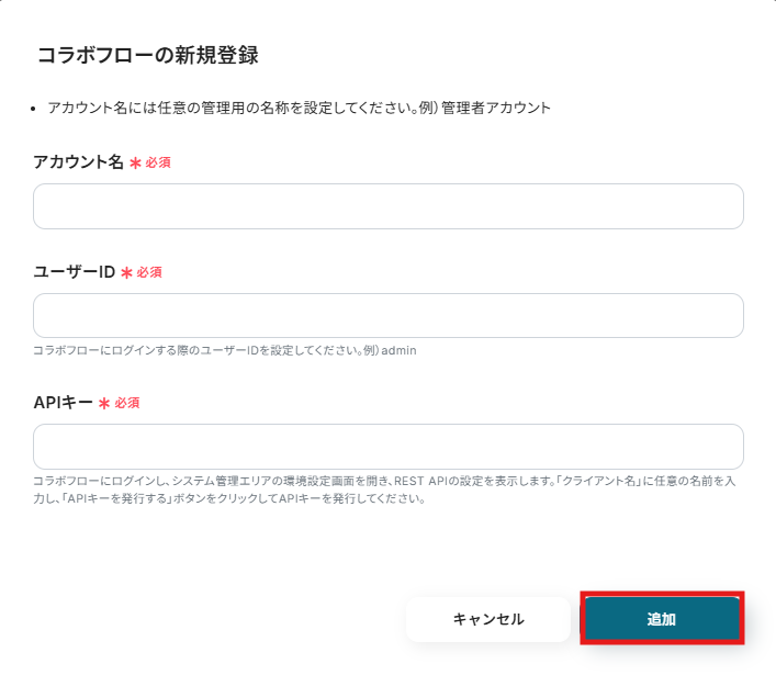 3.コラボフローを選択できたら、アカウント名、ユーザーID、APIキーを入力し、「追加」します。