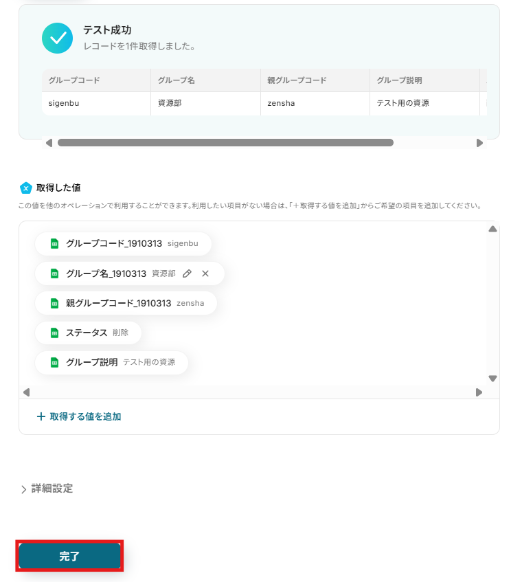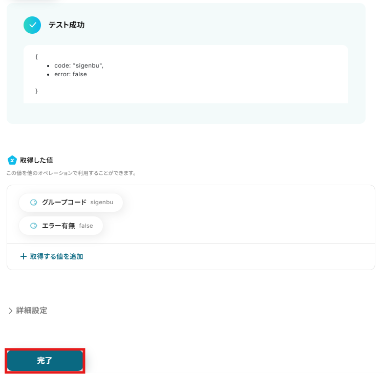 「テスト」をクリックし、取得した値の内容が確認できたら、「完了」をクリックします。