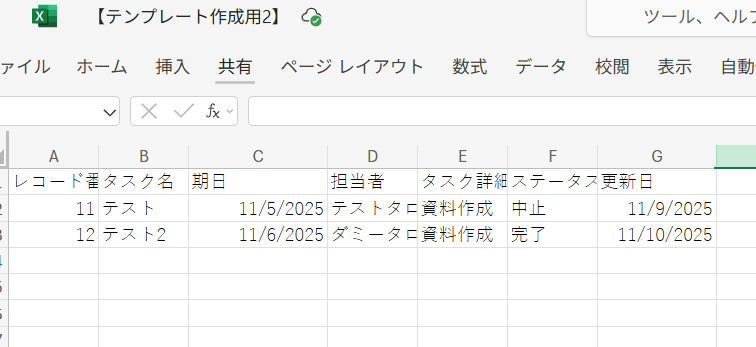 テストに成功すると、取得した値にMicrosoft Excelで取得した情報が追加されます。