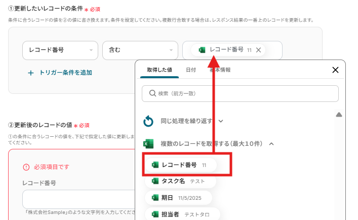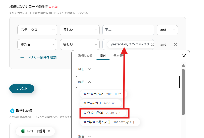更新後のレコードの値も同様に該当するデータを取得した値を使って設定して、「テスト」をクリックします。