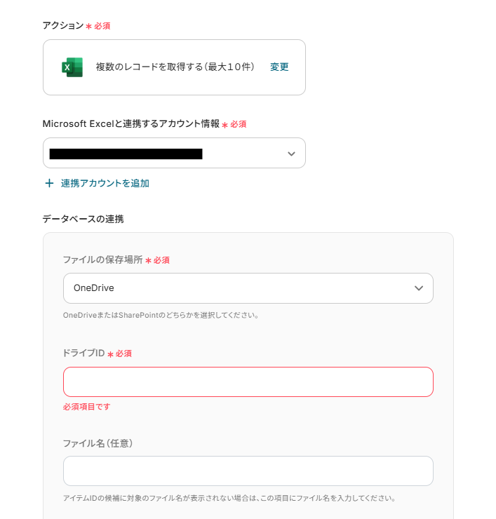 - Microsoft Excelでレコードを取得するアクションでは、対象となるファイルの保存場所やドライブIDなどを任意で設定してください。