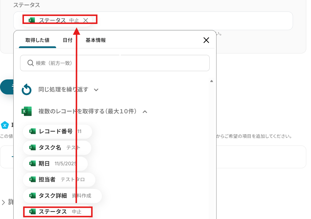 今回は、Microsoft Excelとkintoneでタスクの併用管理をしていることを想定し、前日にステータスが「中止」に更新されたデータを取得できるように設定にしました。