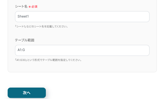 シート名も同様にボックスをクリックすると対象のシートが表示されるので候補から選択してください。