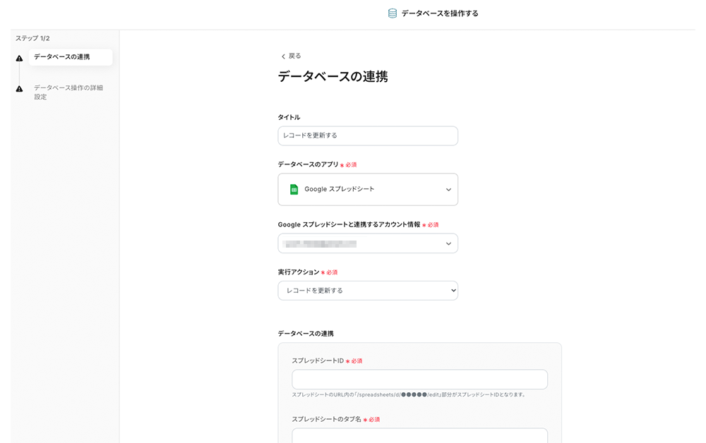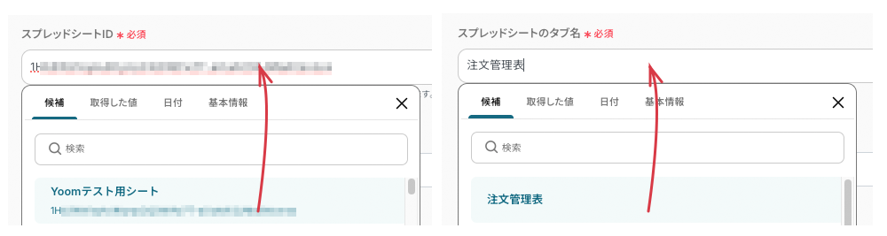 - 指定したシートの項目と空のフィールドが表示されます。この空のフィールドに前の工程で取得した値を紐づけていきます。