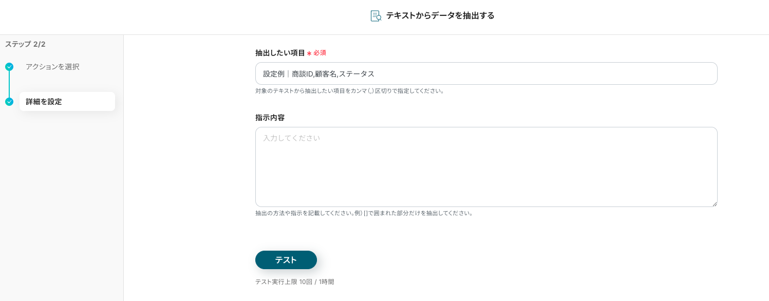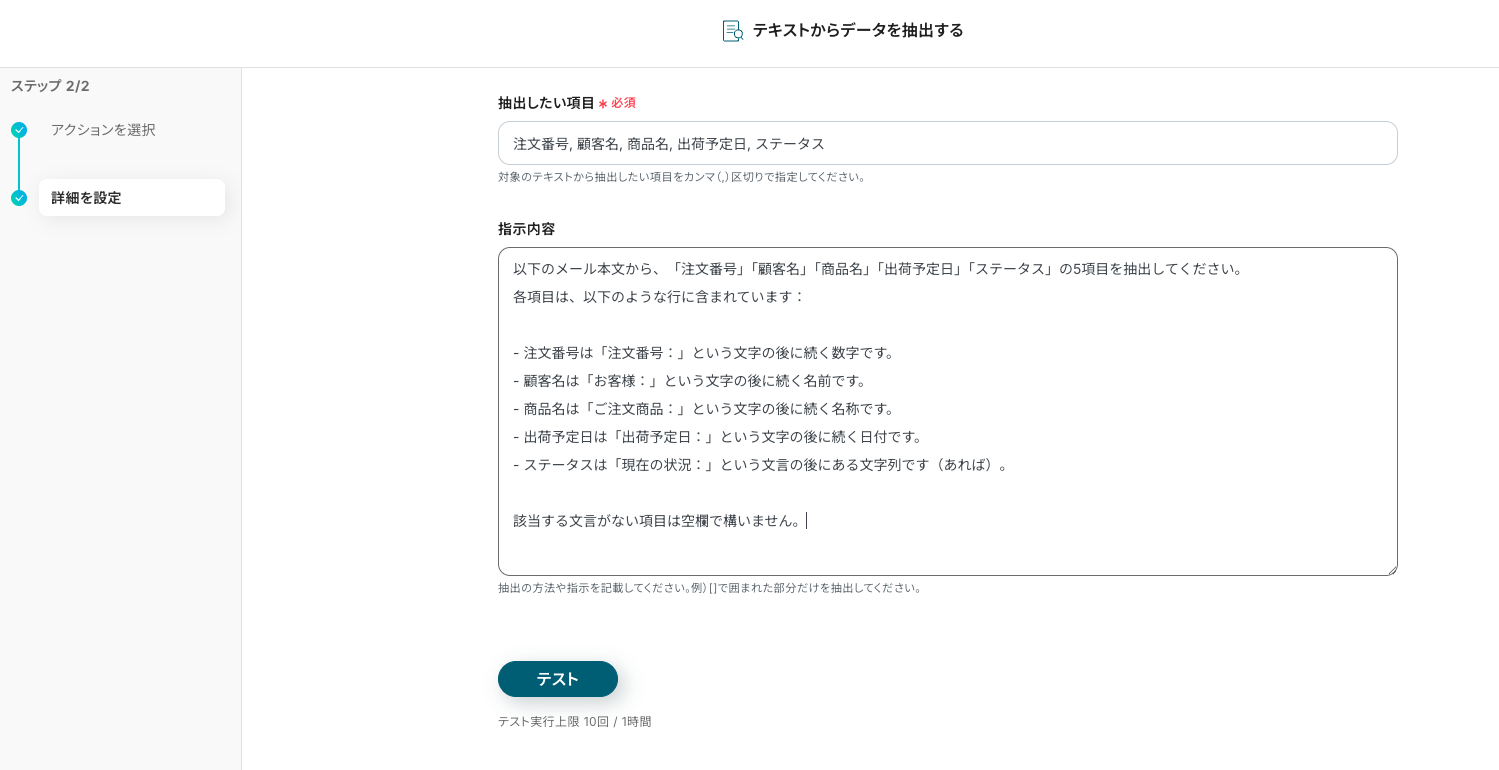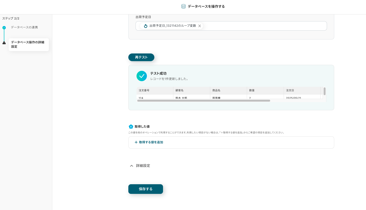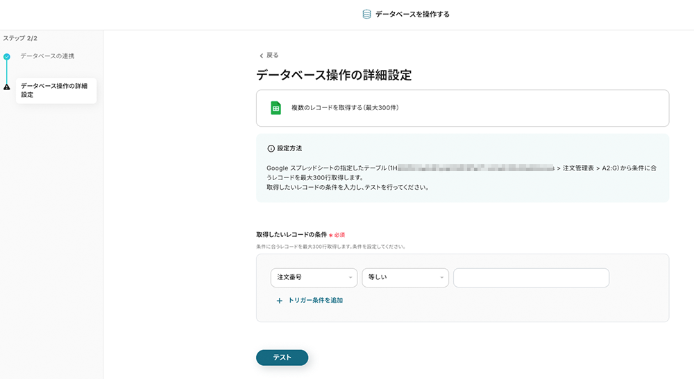 対象列【注文番号】が、【注文番号(取得した値)】と演算子【等しい】を条件にしました。設定を確認できたら、テストボタンをクリックします。